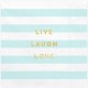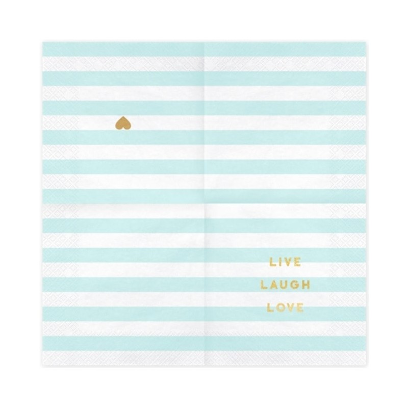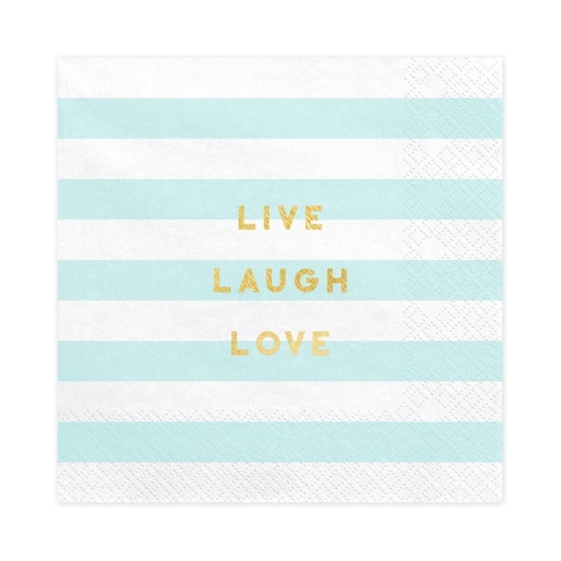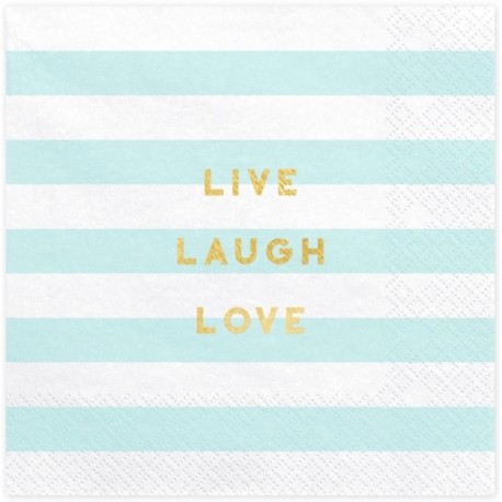 This lovely napkins in striped mint green color features a golden foil message "Live Laugh Love" in one side and a golden foil little heart in the other. Match to other mint and gold colored articles for a perfect decoration!