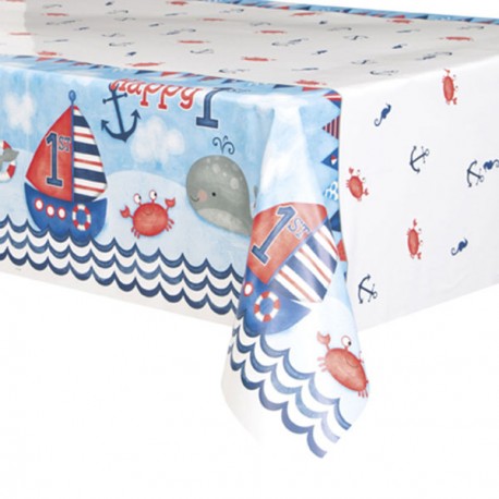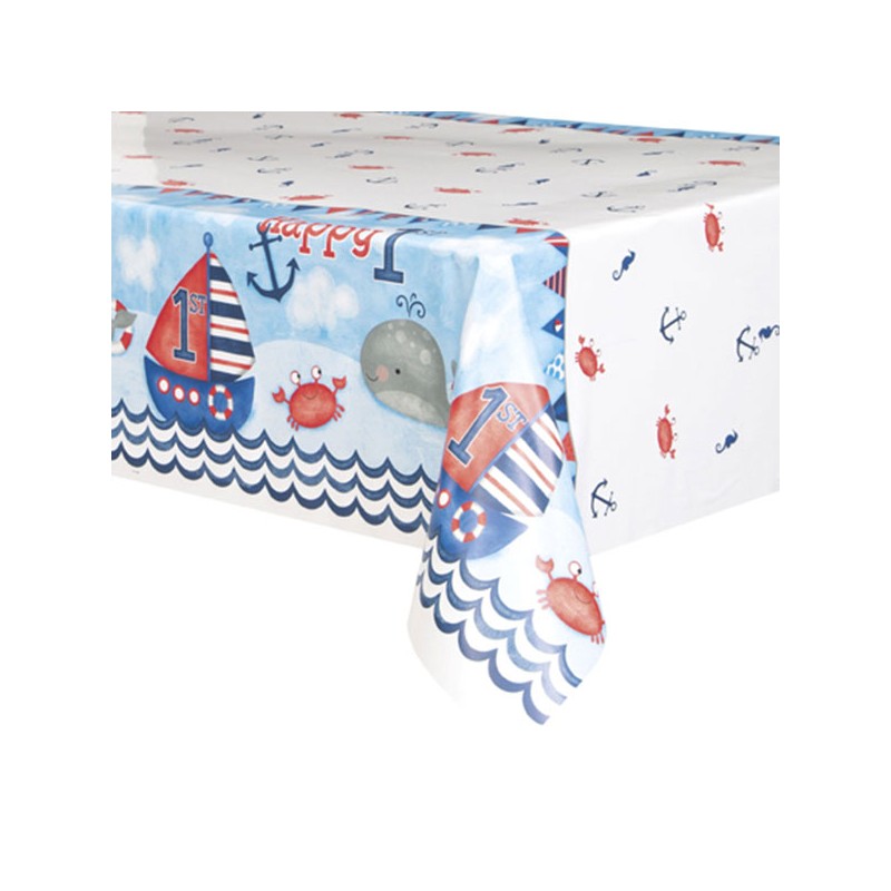 Nautical themed plastic tablecover for boys 1st birthday parties, featuring a sea scene with sail boats and lovely sea animals (a whale and a crab). Match to other Nautical party range articles, accessories and decoration in blue and red colors.