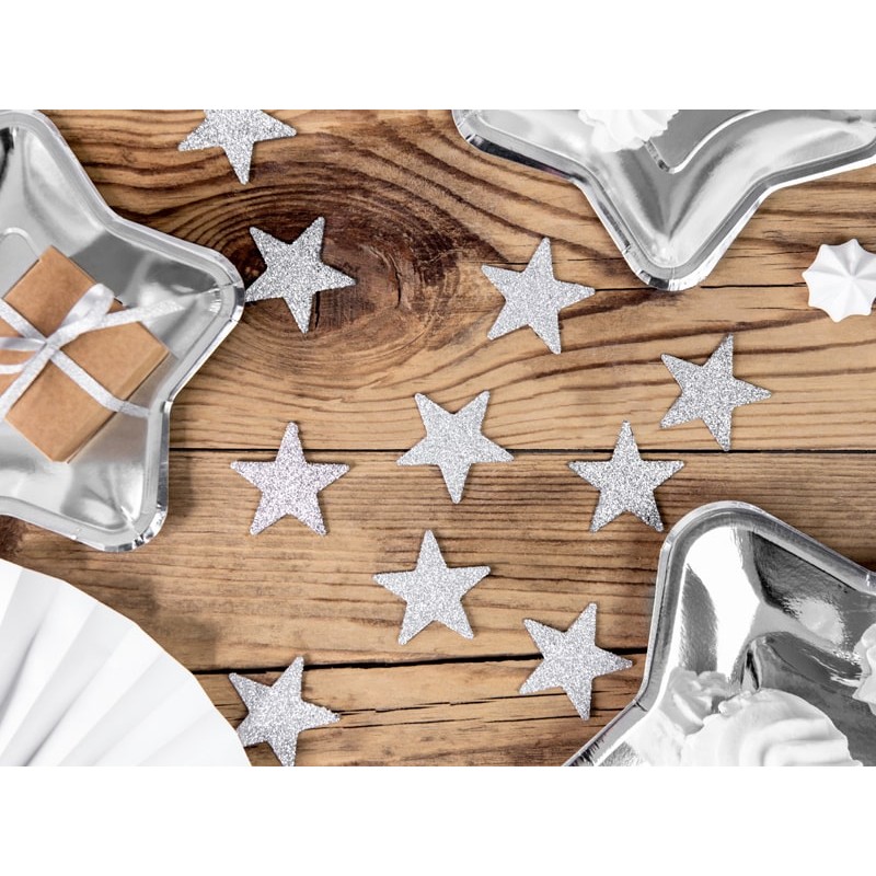 Glittery paper silver stars decorations, adorable to complete the party table decoration! Spread them over the table to create a special effect! Use it to decorate notebooks, kids room walls or whatever your imagination want!