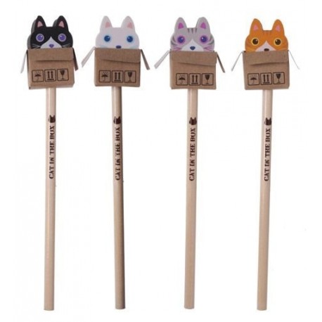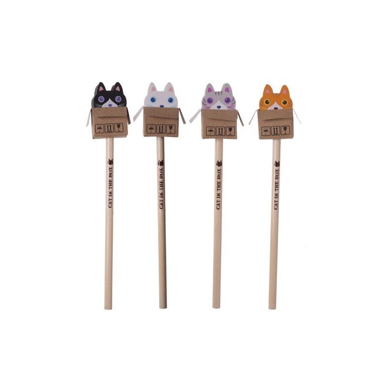 Pencil with rubber, super useful and adorable as going home favor. The wood pencil is decorated with the message "Cat in the Box" and the set is completed with a kitten shaped rubber in assorted colors.