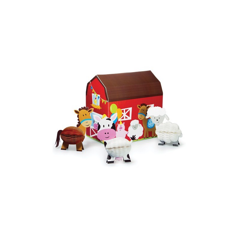 Perfect to decorate Farm themed parties! This centerpiece is composed of a barn and 3 farm animals (horse, cow and sheep). Made of cardboard and easy to assemble.