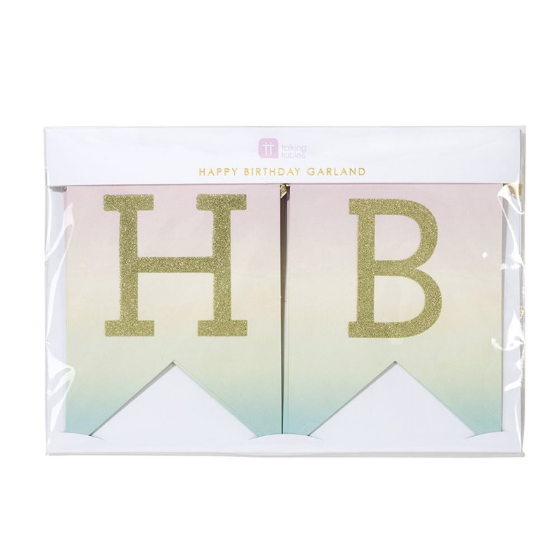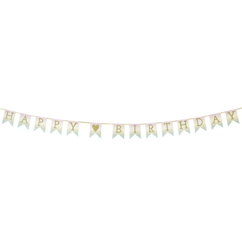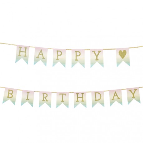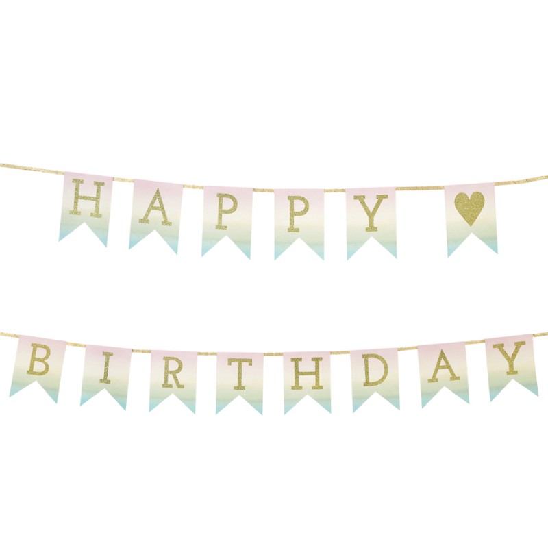 With its delicate gradient of pastel colors and featuring the message "Happy Birthday" in golden glitter letters, this lovely paper flags banner is the perfect addition for sweetly decorated birthday parties.