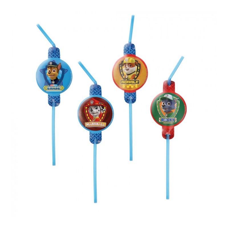 Paw Patrol plastic straws set, featuring Chase, Rubble, Rocky and Marshall. Great to decorate the table and help kids on keeping their own cups during the party! The decoration ca be reused in other straws.