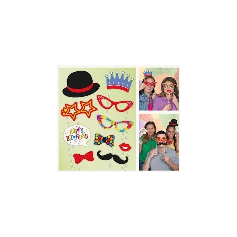 Amazing pictures and great fun to all the party invitees with this photo props set. Comes with 10 card disguises and props (glasses, hat, crown, mustache, mouth etc)