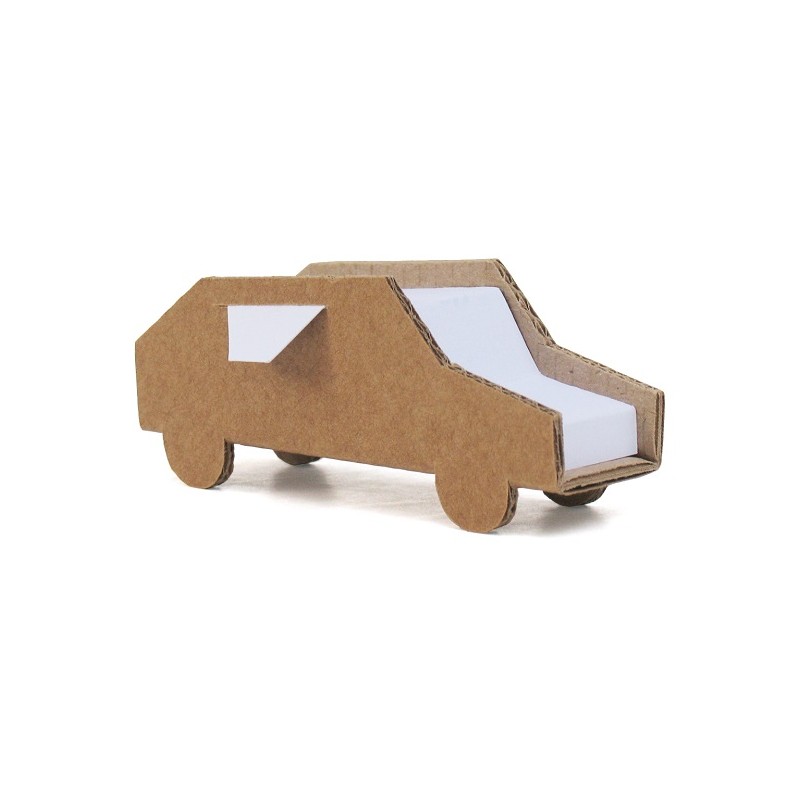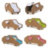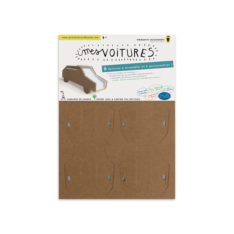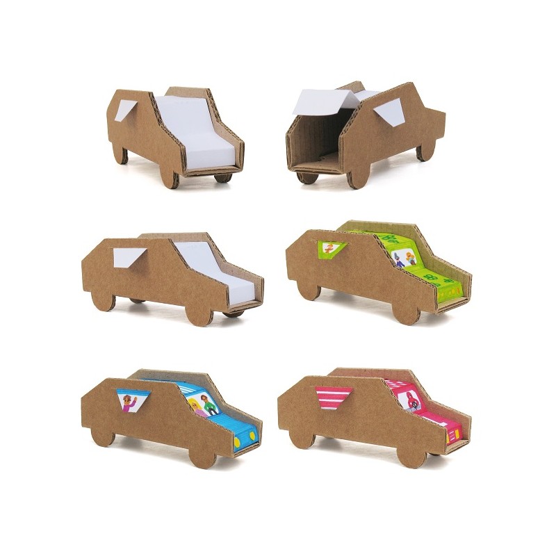 Cardboard cars easy to assemble (without glue or scissors) and personalise with included stickers.