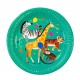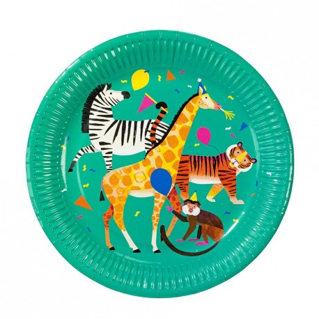 Party Animals paper plates, featuring a zebra, giraffe, tiger and monkey having a party with balloons, flags and confetti, all in a stunning green background. Match to other Party Animals articles, accessories and decoration in yellow.