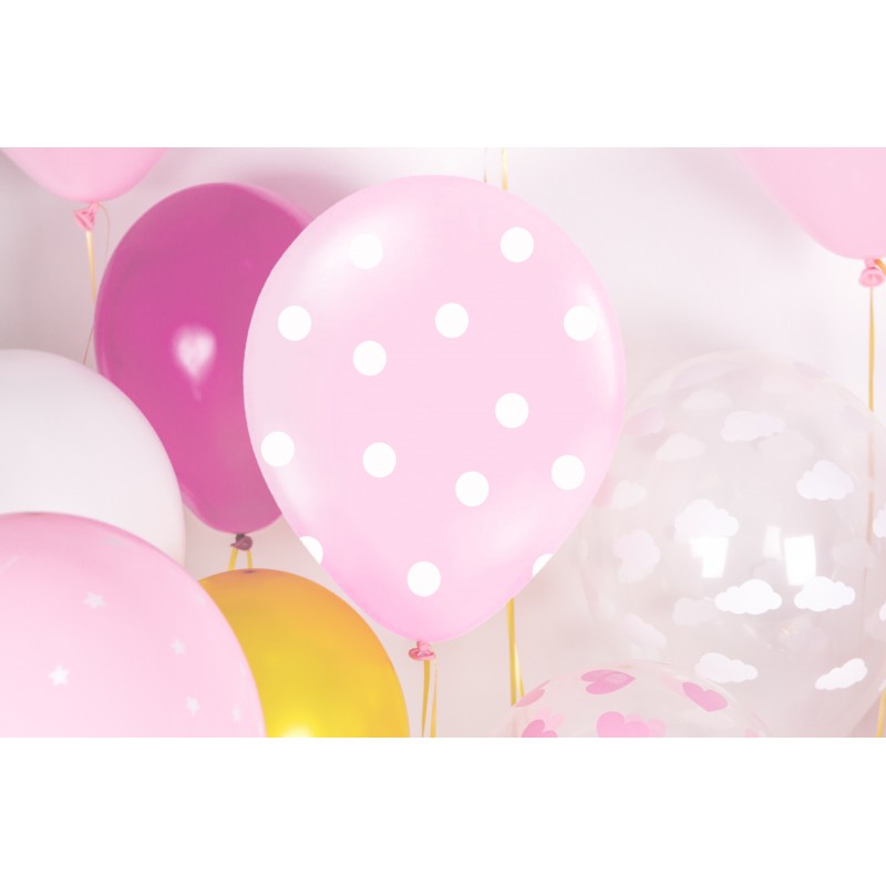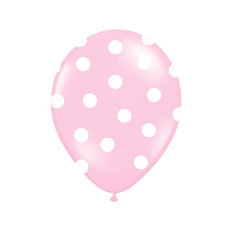 Pastel pink dots latex balloons. Can be filled with air or helium.