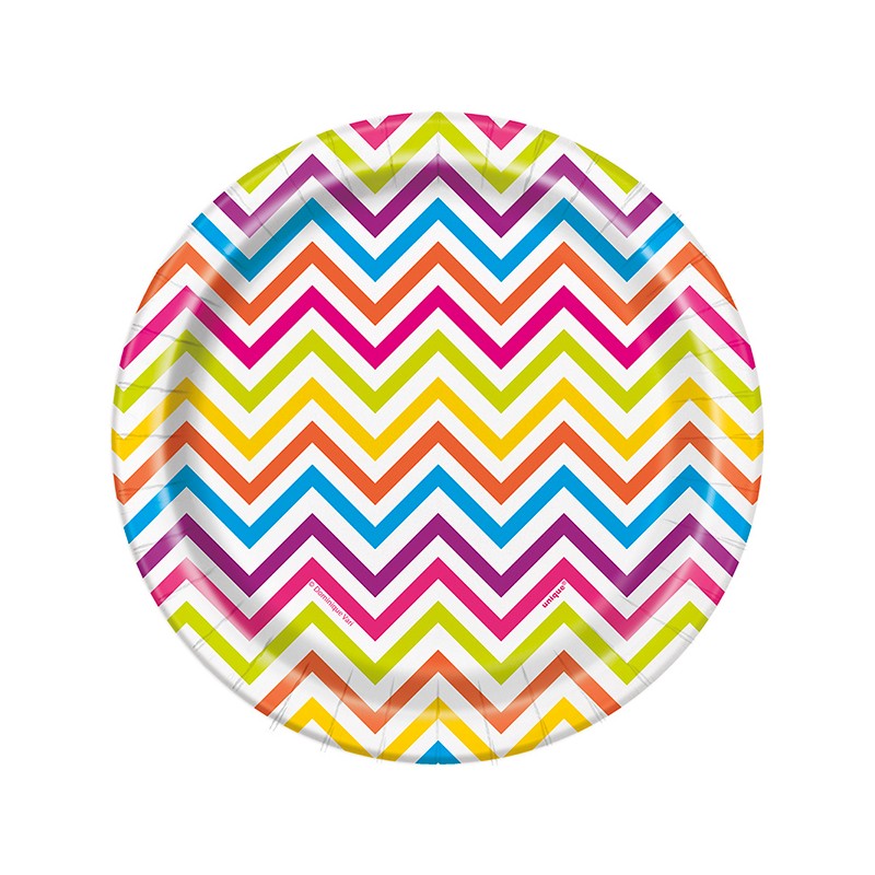 Retro design and a lot of colors in these Rainbow Chevron paper dessert plates, suitable for every age birthday party and many others occasions.