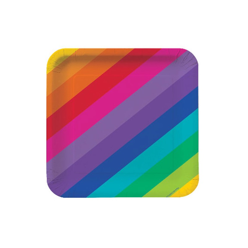 A rainbow of bright colors in these square paper dessert plates from Raibow party range, suitable for every age birthday party and many others occasions.