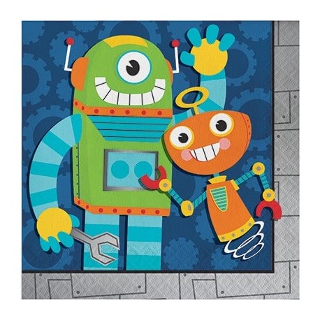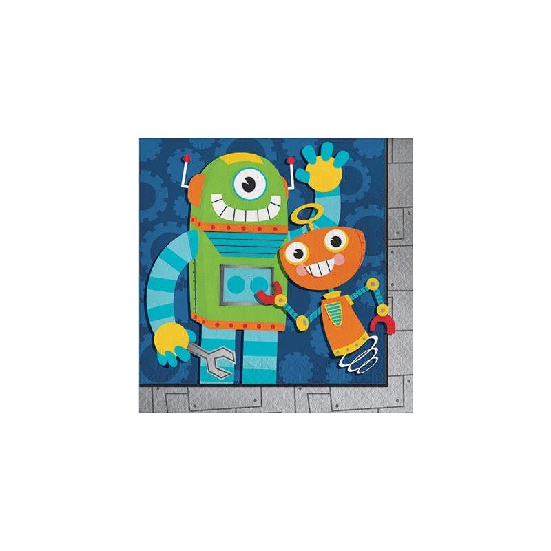 Robot Party theme lunch napkins for kids birthday party. Combine with other Robot theme items, red, green and orange cutlery and balloons for a perfect decoration!