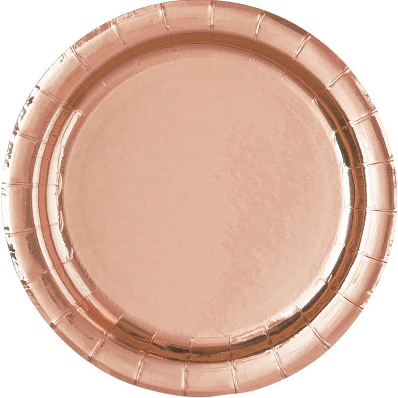 Rose Gold paper foil plates. Match to other Rose Gold articles to create a wonderful table for birthday parties, Baby Showers and Weddings!