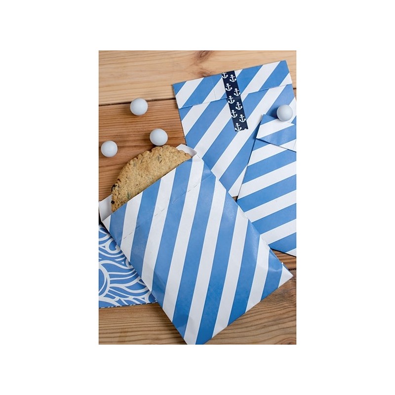 Wonderful set of blue stripes paper treat bags and sea themed assorted stickers, great to decorate the party table and to thank invitees with treats or a small party souvenir.