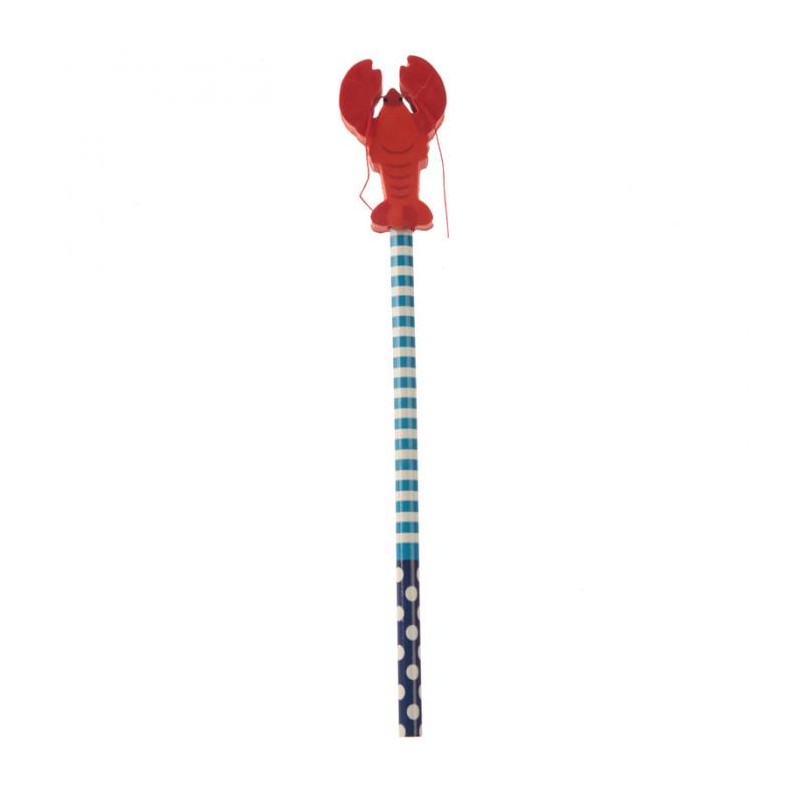 Pencil with rubber, super useful and adorable as going home favor. The wood pencil is decorated in blue and white dots and stripes and the set is completed with a lobster shaped rubber.