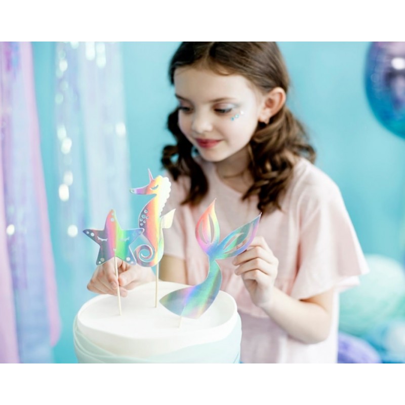 Set of 3 toppers that can be used together to decorate the cake or separately to decorate cupcakes or even the complete buffet! Topper are made in iridescent card with wooden picks. Perfect match to Mermaid party ranges! Complete the decoration with pastel solid colors accessories and decoration.