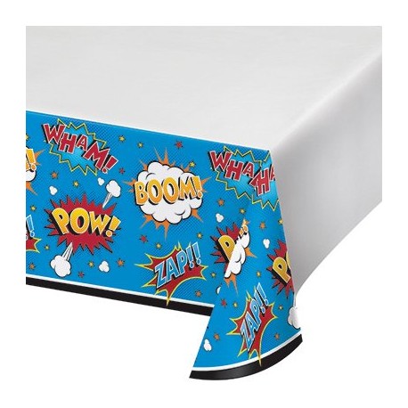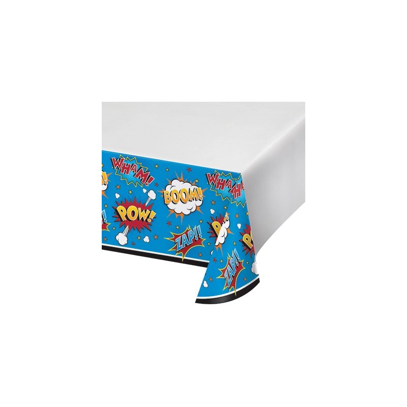 Create an original Superhero party matching this plastic tablecover from Superhero Slogans party range to red, yellow and blue accessories and decoration.