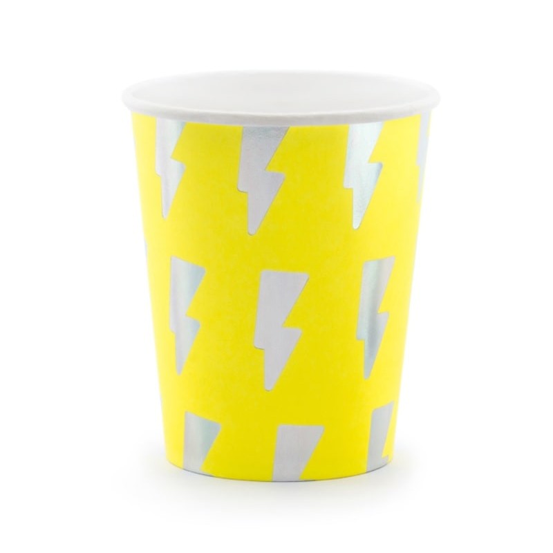 These neon yellow paper cups featuring iridescent lightnings are just perfect to complete Superhero themed parties decoration! Match to other Superhero Slogans party range articles for a complete decoration.