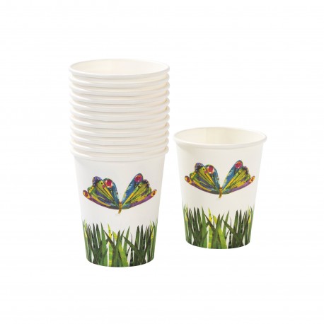 The very hungry caterpillar paper cups. In two different models: the caterpillar with the rainbow and the butterfly in a green gress.