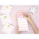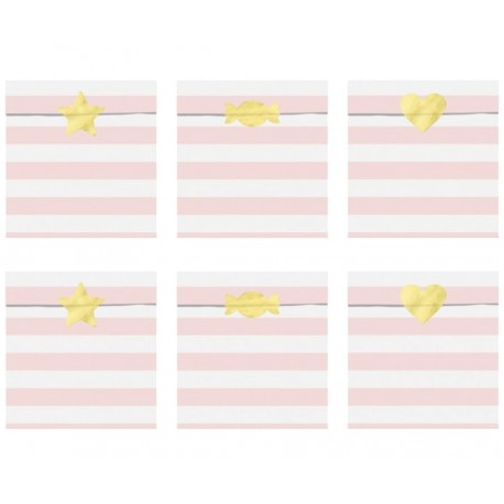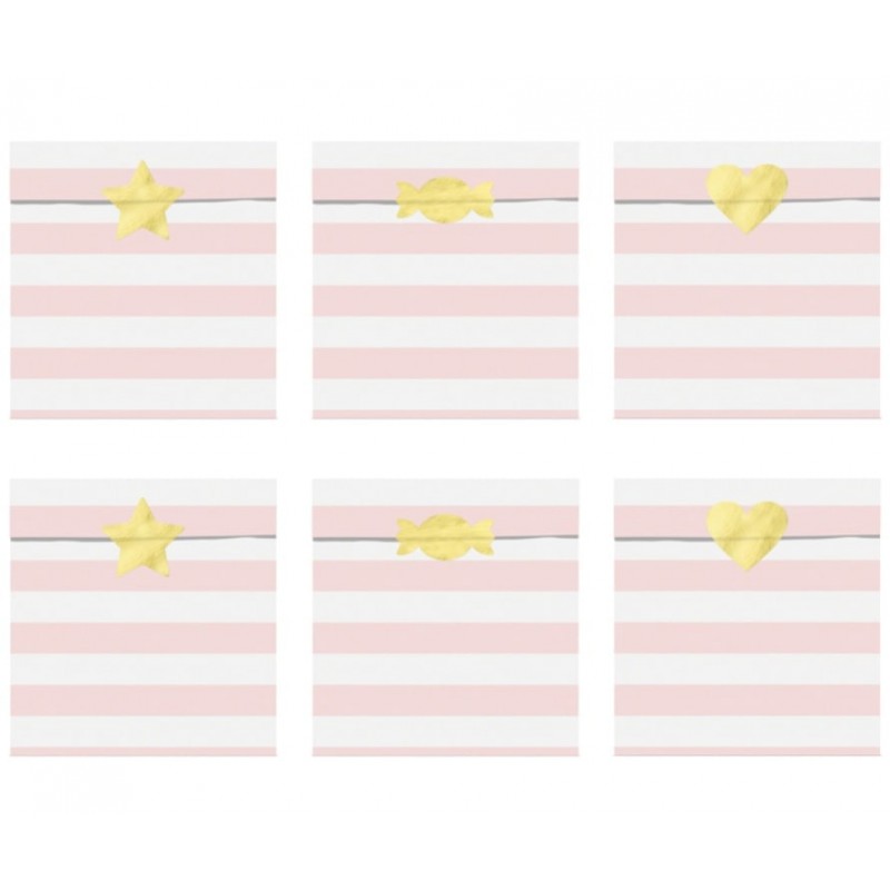 Wonderful set of pastel pink stripes paper treat bags with golden foil assorted stickers, great to decorate the party table and to thank invitees with treats or a small party souvenir.