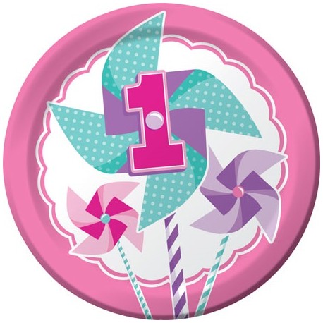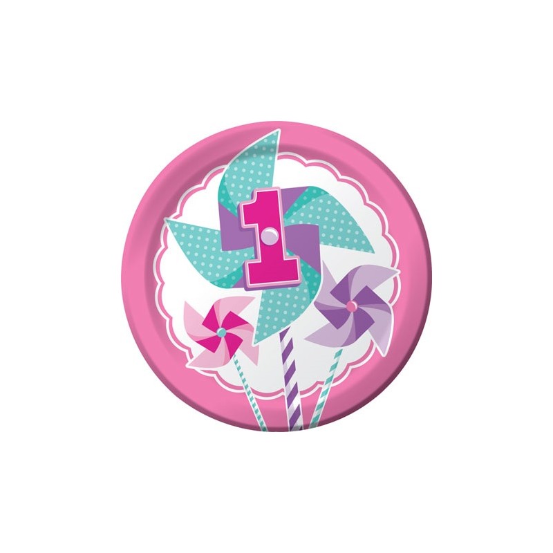 Bring the fascination of pinwheels in the wind to your little girl first birthday party with this lovely range. Match these paper plates with other Turning One Girl articles and decoration in pink and lavender colors.