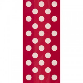 Sacchetti in cellophane rosso a pois bianco, da usare per regalare agli invitati un ricordo della festa. Dimensioni: 28 x 13cm Pezzi: 20