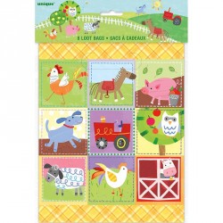 Sacchetti in plastica del coordinato Farm Party, decorati a tema fattoria. Perfetti per riempire di dolcetti e piccoli gadget e regalare agli invitati alla fine della festa compleanno tema Fattoria. Dimensioni: 23 x 19 cm circa Pezzi: 8