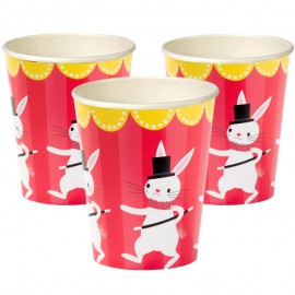 Bicchieri in carta del coordinato Magia, rossi con un coniglio bianco e sua bacchetta magica pronto a festeggiare. Dimensioni: 21 cm Pezzi: 12