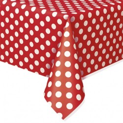 Tovaglia plastica rossa a pois bianco. Dimensioni: 137 x 274 cm Pezzi: 1
