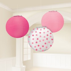 Set di lanterne in carta in tre differenti colori: rosa, fucsia e bianca a pois rosa e fucsia. Appese al soffitto o appoggiate sul tavolo, donano dolcezza alla decorazione della feste di compleanno. Sono anche stupende come decorazione della cameretta! Sono inviate piatte e facili da assemblare. Pezzi: 3 (1 rosa, 1 fucsia e 1 bianca a pois) Dimensioni: 24 cm