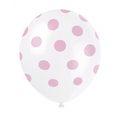Palloncini in lattice di alta qualità bianco a pois rosa. Possono essere gonfiati sia ad aria che a elio. Dimensioni: 30 cm Pezzi: 6