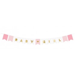 Ghirlanda di bandierine in cartoncino nei colori rosa e bianco, con le lettere per formare "Baby Girl" in oro foil, perfetta per decorare le feste baby shower bimba! Facilissimo da assemblare, basta inserire il nastro (incluso) e appendere. Dimensioni: 15 x 175 cm circa dopo assemblata