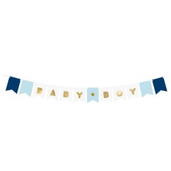Ghirlanda di bandierine in cartoncino nei colori azzurro,blu e bianco, con le lettere per formare "Baby Boy" in oro foil, perfetta per decorare le feste baby shower bimbo! Facilissimo da assemblare, basta inserire il nastro (incluso) e appendere. Dimensioni: 15 x 175 cm circa dopo assemblata