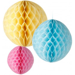 Set di honeycombs in carta in tre colori pastello (rosa, azzurro e giallo), perfetto per decorare le camerette delle bimbe, feste baby shower e compleanno. Possono essere appesi al soffitto oppure collocati sul tavolo. Dimensioni: 30, 25 e 20 cm diametro Pezzi: 3