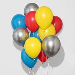 Set di palloncini gialli, rossi, blu e argento metallizzato, perfetto per feste a tema Supereroi! Gonfia i palloncini ad aria o elio, e crea un stupendo bouquet per decorare il tavolo della festa. Abbinalo agli altri articoli del coordinato Supereroi per una decorazione completa. Pezzi: 12 palloncini (3 ogni colore)