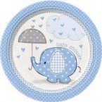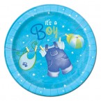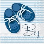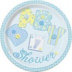 Coordinato Benvenuto per festa Baby Shower bimbo, nei colori azzurro e blu, decorato con delicate righe azzurre, scarpette e vestitini da bebè. Crea la tua festa abbinando gli articoli del coordinato ad accessori e decorazioni in tinta unita azzurro e blu.