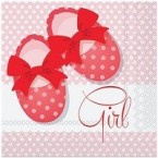 Decorazioni per festa Baby Shower bimba "Benvenuta", nei colori rosa e rosso, decorato con delicati pois, scarpette e vestitini da bebè. Crea la tua festa abbinando gli articoli del coordinato ad accessori e decorazioni in tinta unita rosa e rosso.