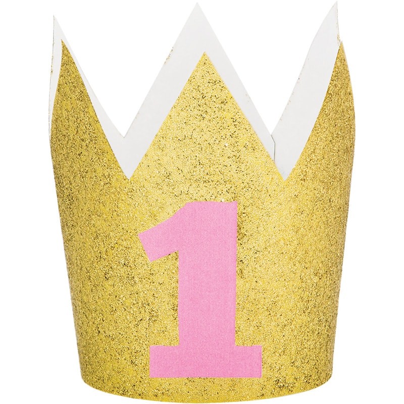 Questa stupenda coroncina è l'accessorio perfetto per il primo compleanno delle bambine! Realizzata in cartoncino ricoperto con glitter colore oro, decorata con il numero 1 rosa e completa di elastico.