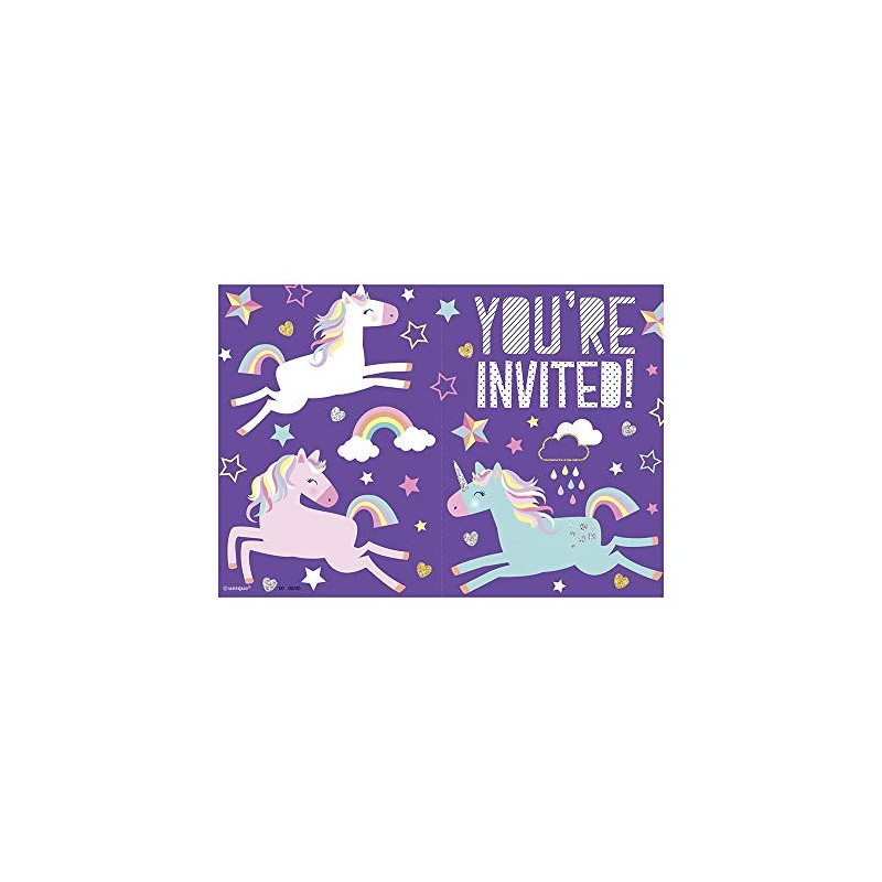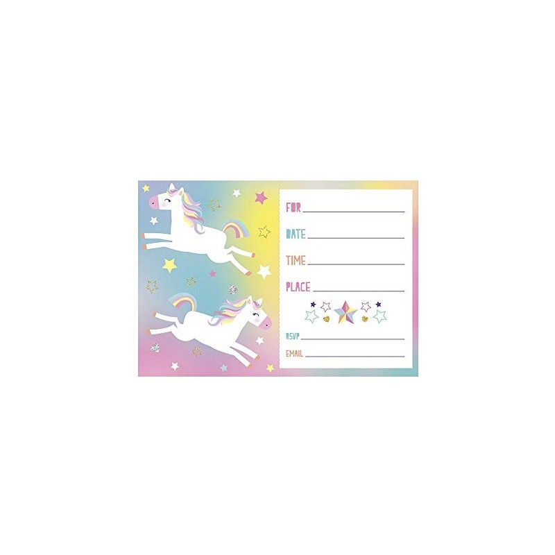 Biglietti invito Unicorn Rainbow. Abbinali agli altri articoli del coordinato per una festa completa a tema Unicorno! Le bustine sono incluse.