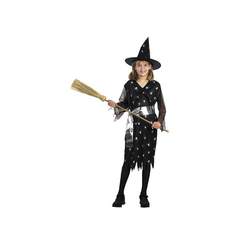 Costume Strega nero con ragnetti per festa Halloween bambini. Contiene cappello, abito e cintura. La scopa non è inclusa.