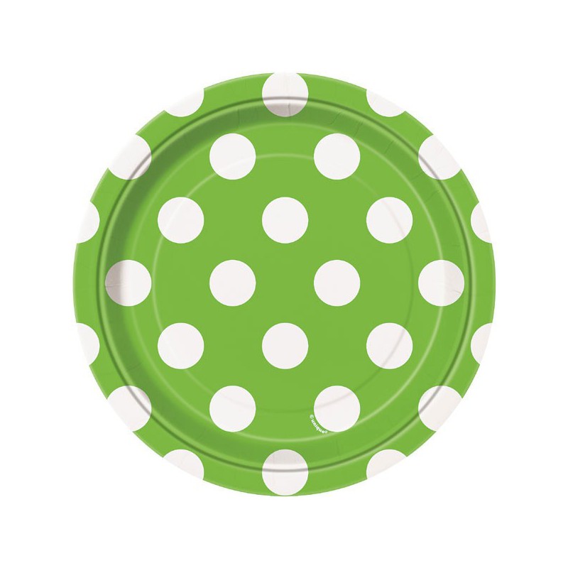 Piattini in carta alta qualità nel colore verde a pois bianco per feste compleanno o qualsiasi altra occasione speciale. Abbina agli altri articoli del coordinato in tinta unita verde per una decorazione perfetta!
