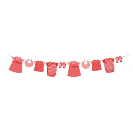 Ghirlanda di vestitini in cartoncino nei colori rosa e rosso, adorabile per decorare le feste baby shower bimba, da appendere al bordo del tavolo o alla parete. I vestitini devono essere infilati nel cordoncino (incluso).