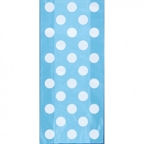 Sacchetti in cellophane azzurro a pois bianco, da utilizzare per imballare piccoli regalini di fine festa agli invitati. Abbina agli altri articoli del coordinato.