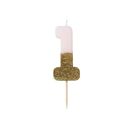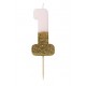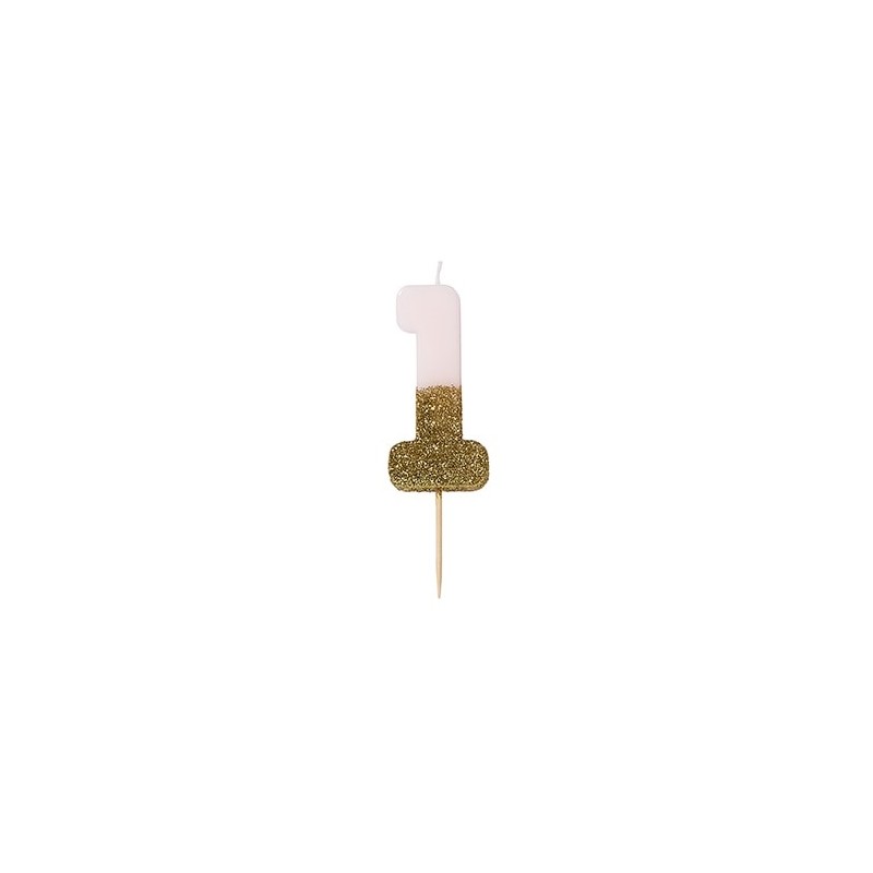 Questa adorabile candelina a forma di numero 1 nel colore rosa pastello molto chiaro ha una parte ricoperta in glitter oro ed è perfetta per decorare le torte primo compleanno!