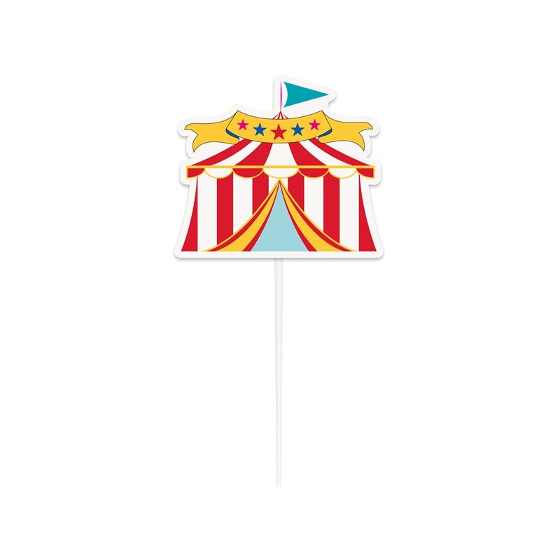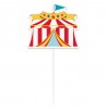 Questo cake topper per torta a tema Circo è formato da un tendone da Circo in cartoncino e un'asticella in plastica. Ideale per decorare non solo la torta ma, tutto il buffet. Abbinalo agli altri articoli a tema Circo per una decorazione completa!