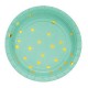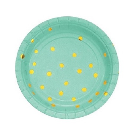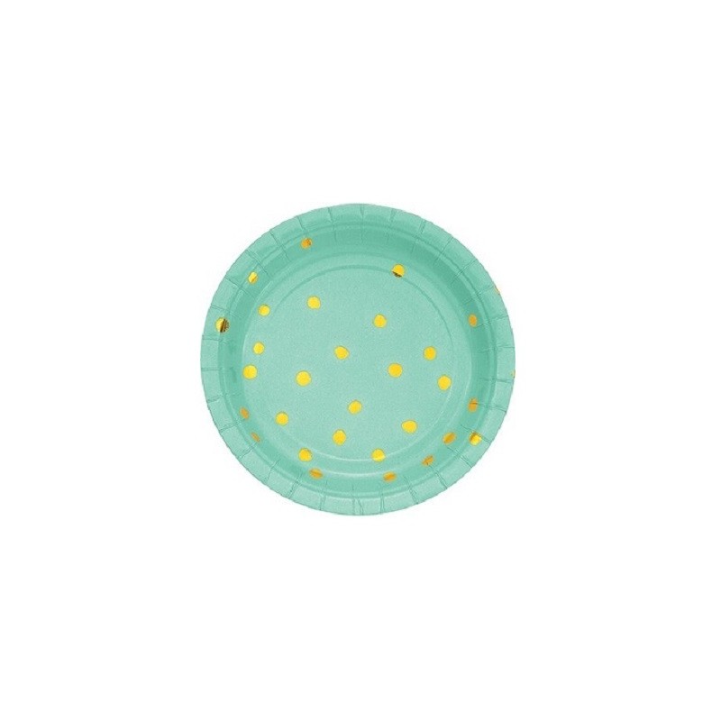 Piattini in carta colore verde menta a pois oro foil. Abbina ad altri articoli menta e oro per una decorazione perfetta!