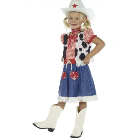 Costume per una dolcissima Cowgirl! Ideale per Carnevale o per feste a tema Fattoria. Include vestito, gilet, fascia, cintura e cappello.