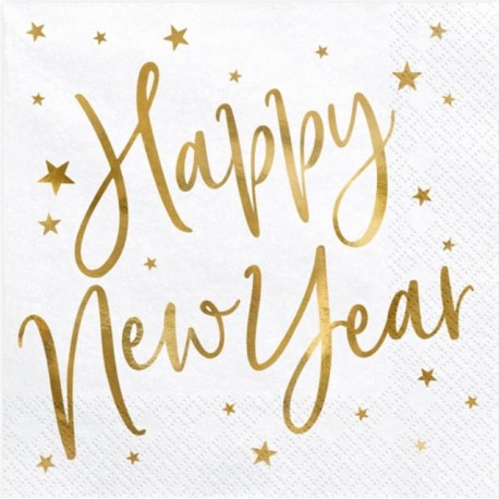 Tovaglioli in carta bianca decorati con la frase "Happy New Year" in oro foil. Abbinali ad altri articoli colori oro per decorare la tua festa di Capodanno!