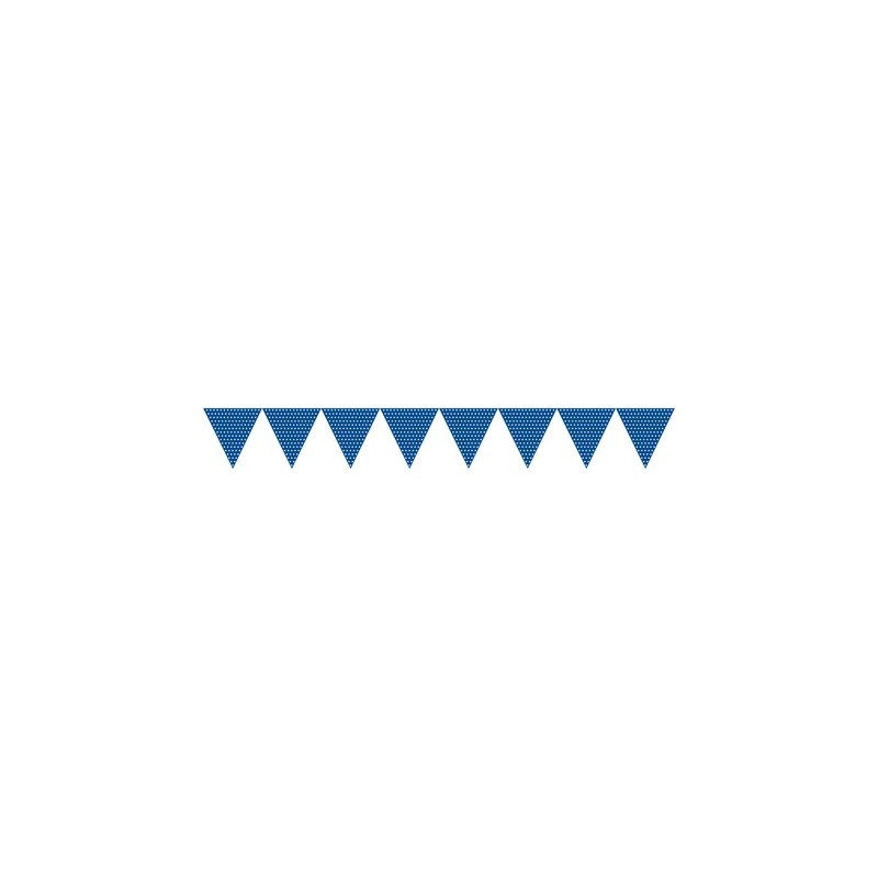 Festone di bandierine triangolari in carta blu a pois bianco. Le bandierine sono legate con un nastro in tessuto.