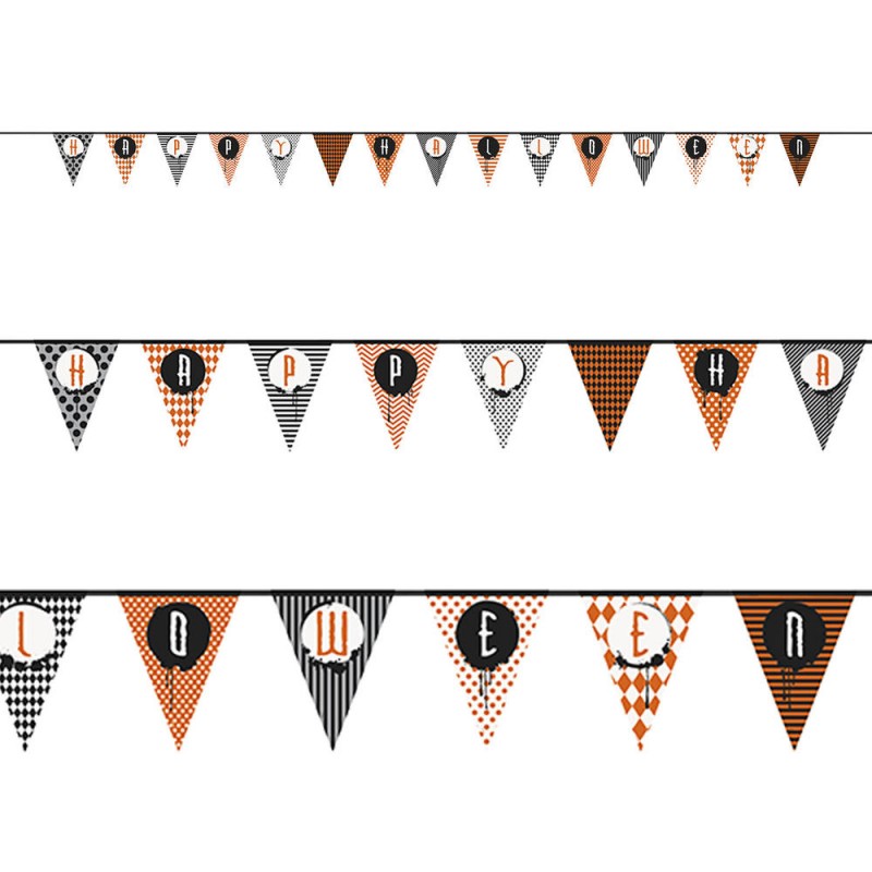 Banner bandierine in cartoncino con la scritta "Happy Halloween", decorato nei colori grigio, nero e arancione.