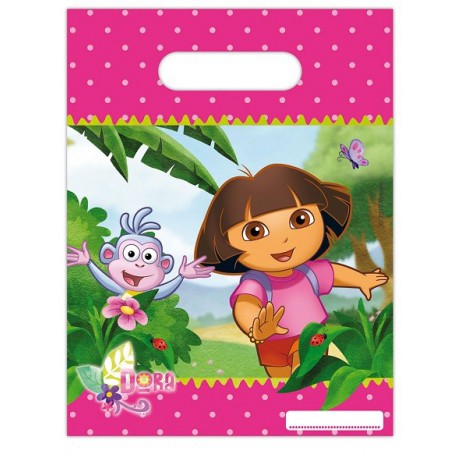 Borsine party in plastica del coordinato Dora per festa compleanno bambini. Riempile di regalini e distribuiscile ai bambini alla fine della festa!