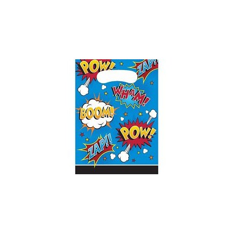 Per i regalini della festa a tema Supereroi queste sono le bustine perfette! In plastica, con stampati gli slogan delle lotte da supereroi "Pow", "Boom" etc